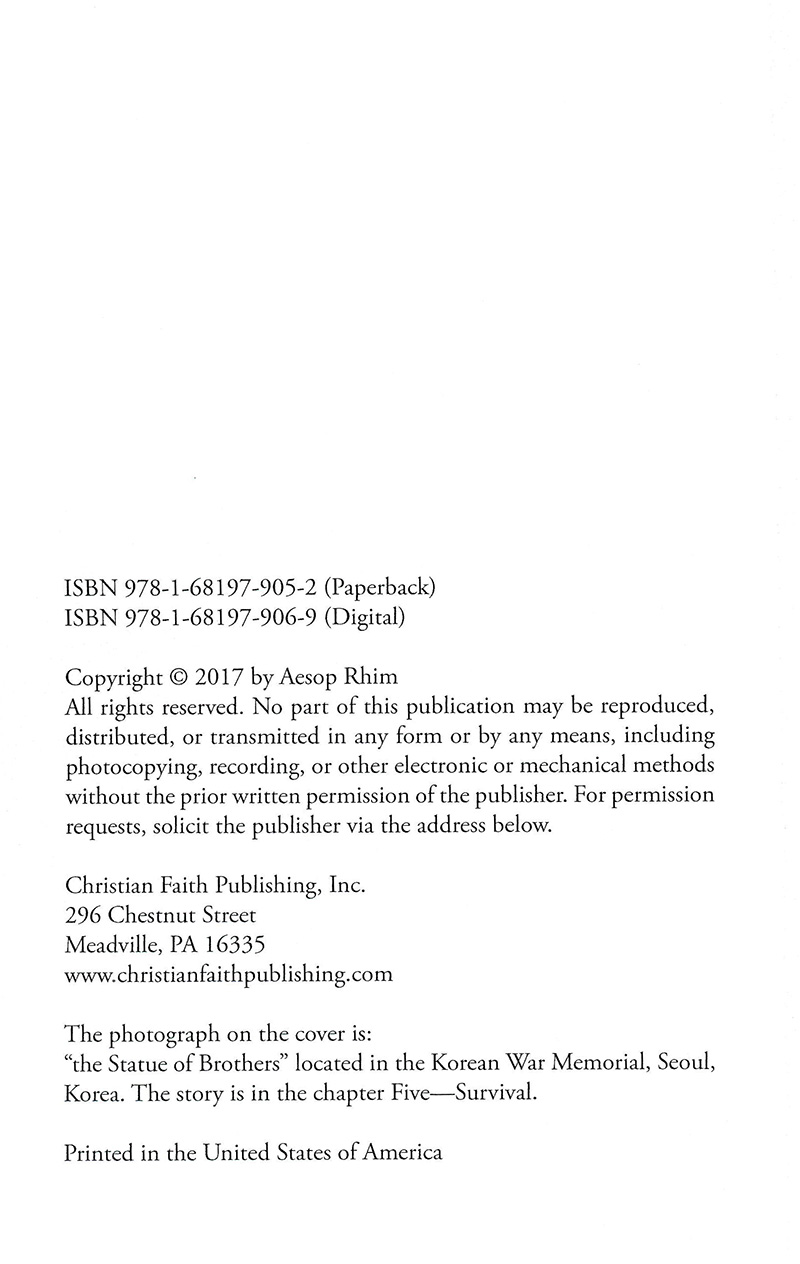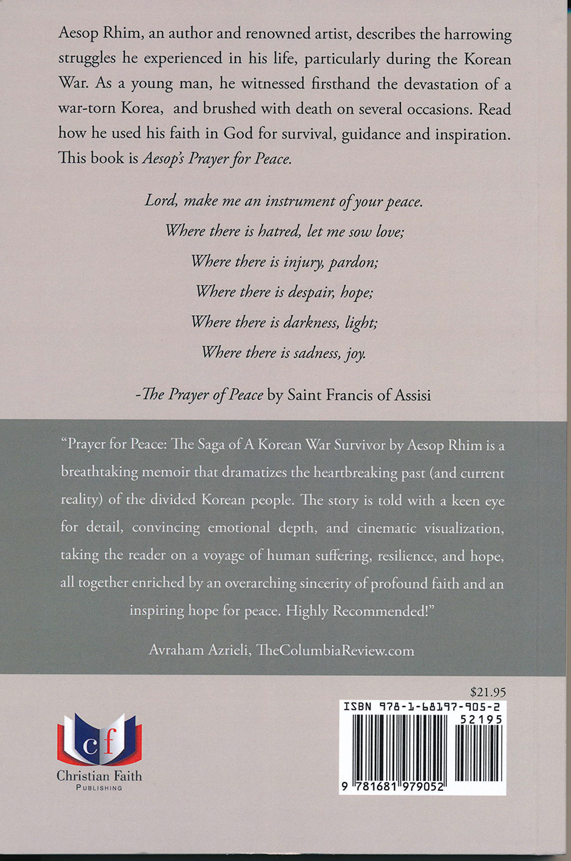 AESOP RHIM MEMOIR “Prayer for Peace; The Saga of A Korean War Survivor” Author Aesop Rhim's newly released “Prayer for Peace: The Saga of a Korean War Survivor” is one man’s story of how his faith turned his war experiences into forgiveness and peace activism. From Christian Faith Publishing, “Prayer for Peace: The Saga of a Korean War Survivor” is the tale of a young man whose life was devastated by war, but redeemed by God. Aesop rebuilt his life, only to later learn of the toll that the North Korean regime had taken on his family in the ensuing years. Today, he is 84 years old, an artist for peace, family man, and missionary to Africa. “When the Korean War began in June of 1950, I was a teenage boy living in Chosan, a town near the Yalu River in North Korea. My entire high school class was drafted to serve in the war. Facing the horrors of war, I chose to defect and make my way into South Korea. During these days of the Korean War, I struggled for arduous days of walking, exhaustion and starvation. After several deadly skirmishes, I was captured by South Korean local guards and they beat me severely. Death seemed imminent. I prayed for God’s mercy while imprisoned. Miraculously, the South Korean army’s unit officer was from my home-town in North Korea and recognized me. The officer pardoned me and allowed me to join the South Korean army. My life was spared.” --Aesop Rhim Against all odds, Aesop eventually graduated from the fine arts college of Seoul National University to become an artist, and then immigrated to the United States and graduated from the Institute of Design at the Illinois Institute of Technology. In 1997, he had the opportunity to travel back to North Korea on a peace mission, where he was reunited with his siblings. In Pyongyang, he witnessed the deprivations of North Korea. Aesop was shocked to learn from his sister that in the winter of 1975, his mother and older brother, along with his brother’s family, were sent to a concentration camp. It was a devastating moment for Aesop, but he prayed for God’s guidance and mercy for his family and the North Korean people. In 2001, when Aesop encountered the tragedy of the 9/11 terrorism in New York, he felt a personal awakening and resolve to use his art as a tool for peace. Aesop immediately created his “Prayer for Peace” art exhibition, which explored peace in different ways for over a decade. “Prayer for Peace: The Saga of a Korean War Survivor” is his harrowing story of war, peace, and faith. View a synopsis of “Prayer for Peace: The Saga of a Korean War Survivor” on YouTube. Consumers can purchase “Prayer for Peace: The Saga of a Korean War Survivor” at traditional brick & mortar bookstores, or online at Amazon.com, Apple iTunes store, Kobo or Barnes and Noble. ~ Christian Faith Publishing |
