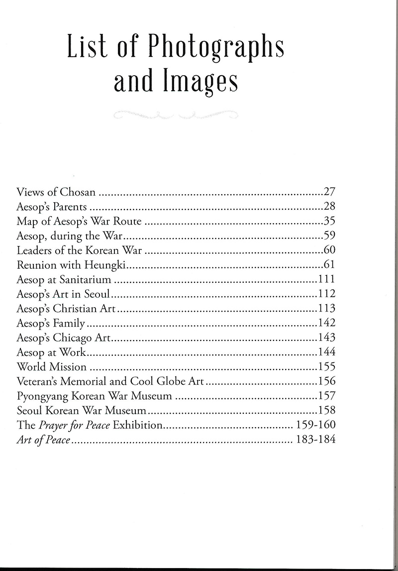 During the Korean War, as a teen-ager, Aesop carried rifle of both North and South Korean armies and then became a soldier of Christ to serve as a peace initiator through his art profession. Aesop stated "Achieving peace requires all parties to trust each other, commit to constructive wisdom, and have the courage to move forward toward unity with conviction and patience. In this recounting of my story, I am expressing my thoughts on how to achieve peace in Korea based on my experiences during the war and the peace initiatives in which I have been engaged"
